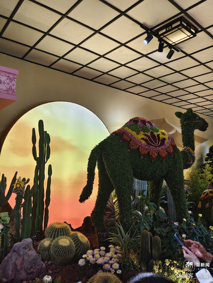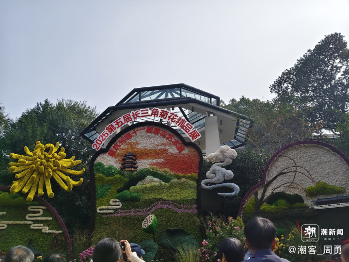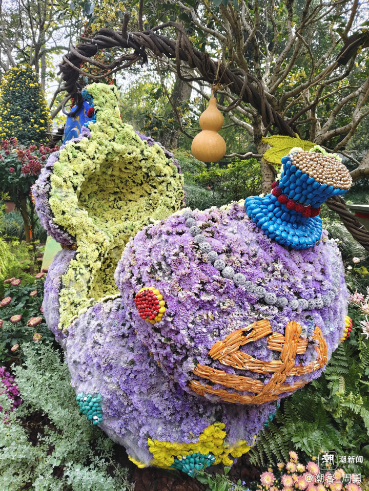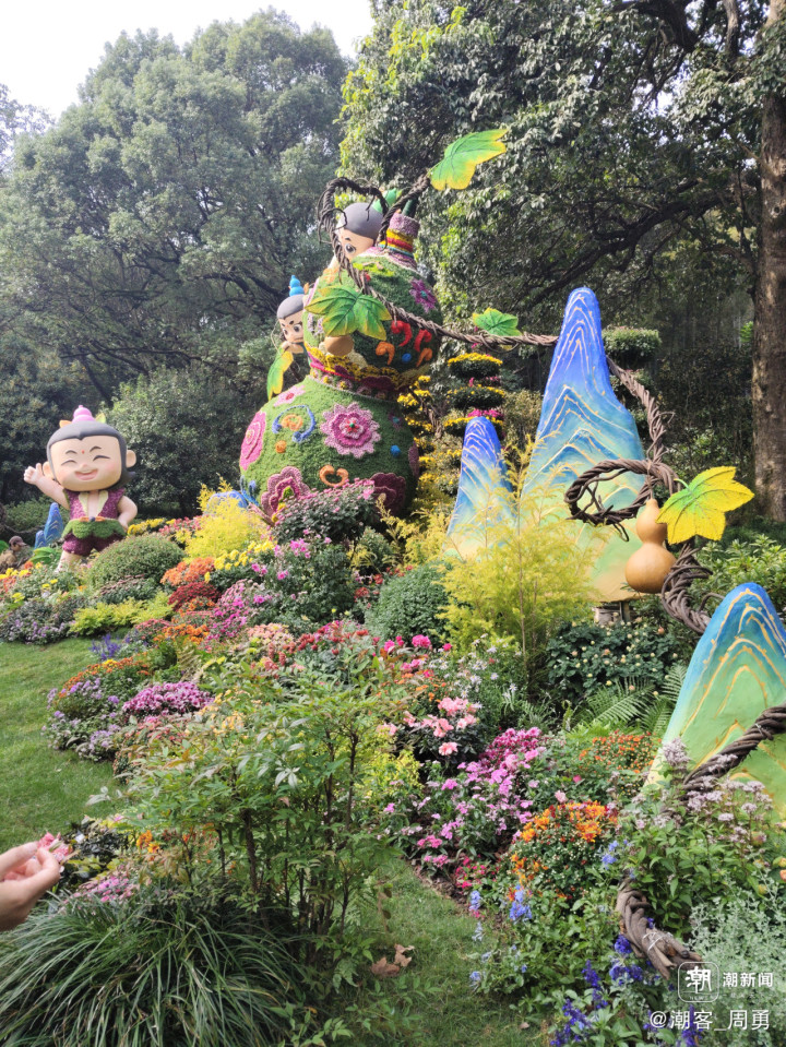 对科技与生态融合的怡情再现。富阳区综合执法局选送的《葫芦童忆》吸引众多家长和孩子留影。以饱满绽放的菊花为肌、柔韧的植物藤蔓为骨,将经典的葫芦娃形象与科技机器狗造型融入菊花展创作。葫芦娃承载童年记忆,以自然材料还原其灵动模样;机器狗则打破“科技”与“生态”的刻板界限,用菊花的柔与植物的朴,诠释科技发展可与绿色共生。这样的设计可谓用心工巧,恰切的诠释了“科技与生态相融”的理念。同样,杭州植物园选送的《花满杭城·数字绽芳华》也是这一理念的实践佳作。作品以“花满杭城路·数字绽芳华”为主题,巧妙融合拱门、弧形景墙与曲线型楼梯三大主体框架,在呼应“通向幸福的花路”的美好寓意的基础上,注入科技活力,让游人在沉浸式赏菊间,同步感受杭城的浪漫生机与现代科技魅力。景观的三个层次——下层的机器狗,中层有科技方块元素的景墙,上层的巨型无人机,形成“花——景——科技”交织的立体画面,生动、深远,令人感慨。