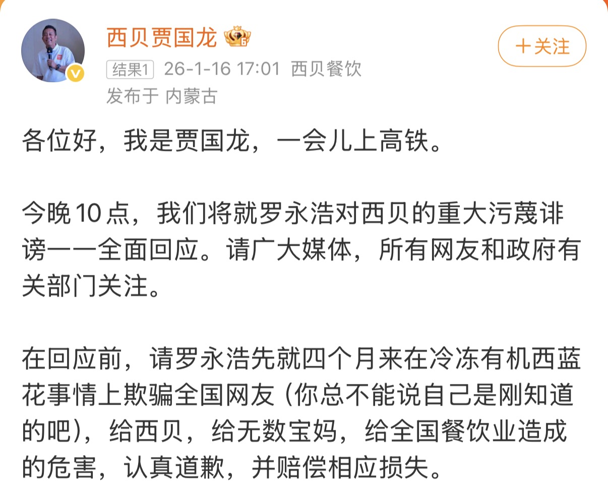 今晚10点,我们将就罗永浩对西贝的重大污蔑诽谤一一全面回应。请广大媒体,所有网友和政府有关部门关注。